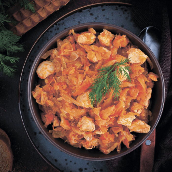 For your main course, savor the delectable Braised Cabbage with Chicken. Tender chicken is slow-cooked with cabbage until it becomes melt-in-your-mouth deliciousness. The dish is seasoned to perfection, creating an irresistible combination of flavors that will leave you satisfied.